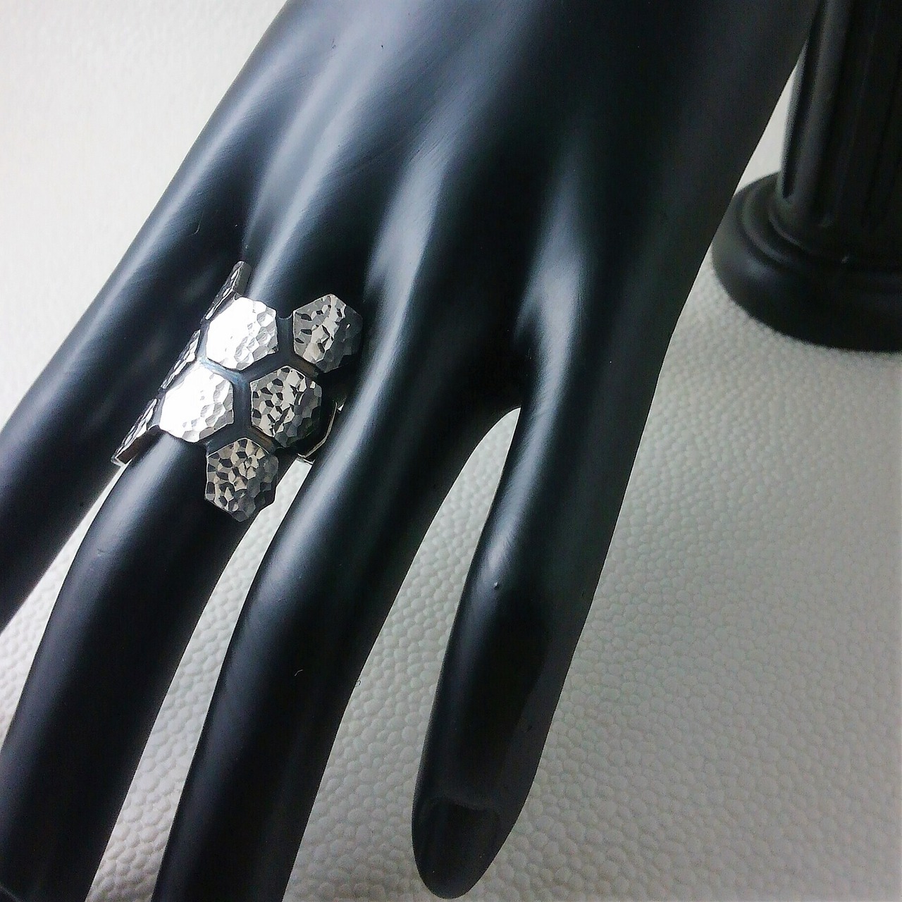六角形のピースをパズルの様につなぎ合わせ蜂の巣で知られるハニカム構造をモチーフとした指輪です。